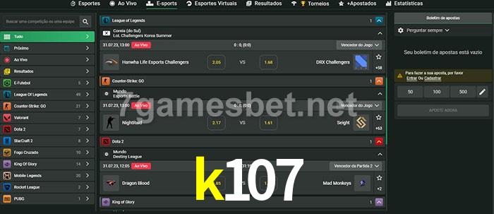 O k107 oferece uma grande seleção de opções de apostas em e-sports com probabilidades competitivas